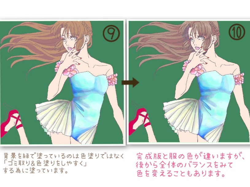 ⑪ほぼ一通りの色塗りが終わったら、全体の色バランスを見るために背景の緑色を消します。