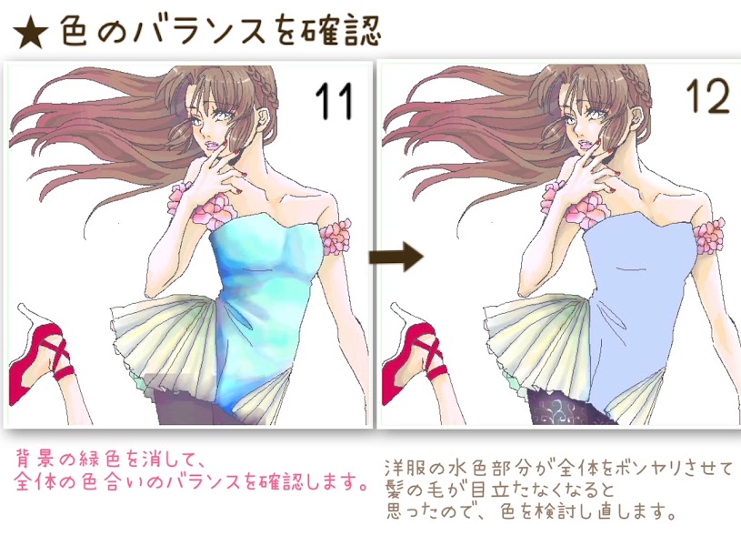 今回はこのように色味バランスを見たときに、洋服の水色部分がチカチカして目立たせたい髪の毛の印象が弱くなっていると感じたので、この時点で色を変更することにしました。
