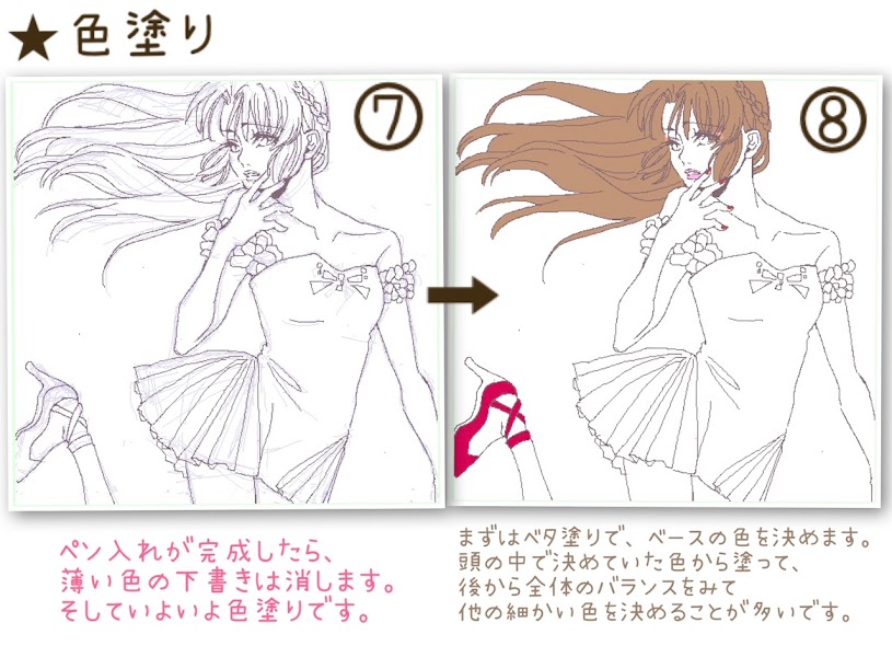 ⑦このようにペン入れが完成したら、薄い色の下書きは消していよいよ色塗りに入ります。