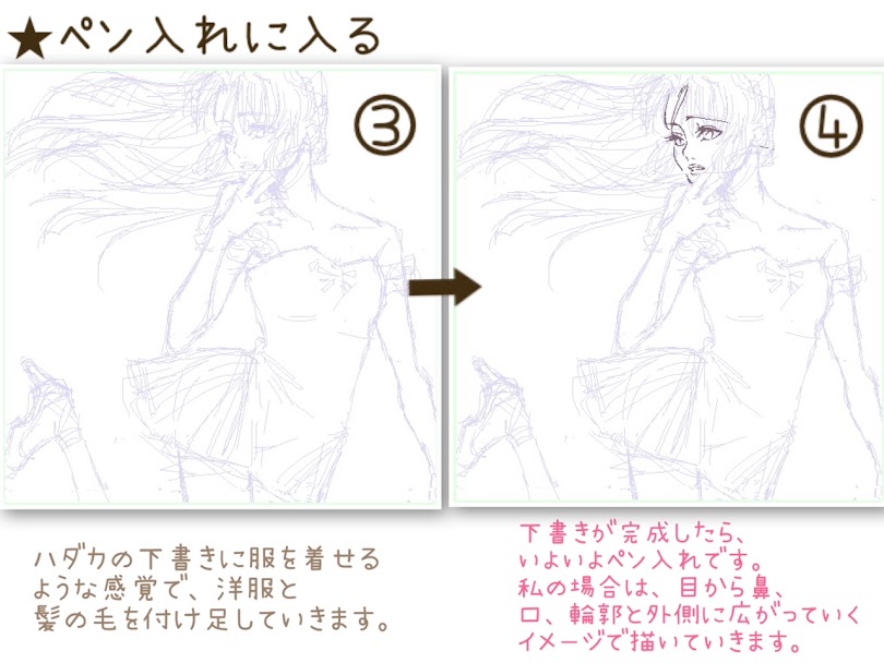 ③髪の毛をおおまかな流れがわかるように描き入れ、洋服も体に沿わせるように描きます。