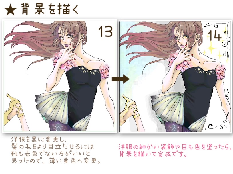 ⑭最後に全体の色味やバランスをみて背景を描き入れます。